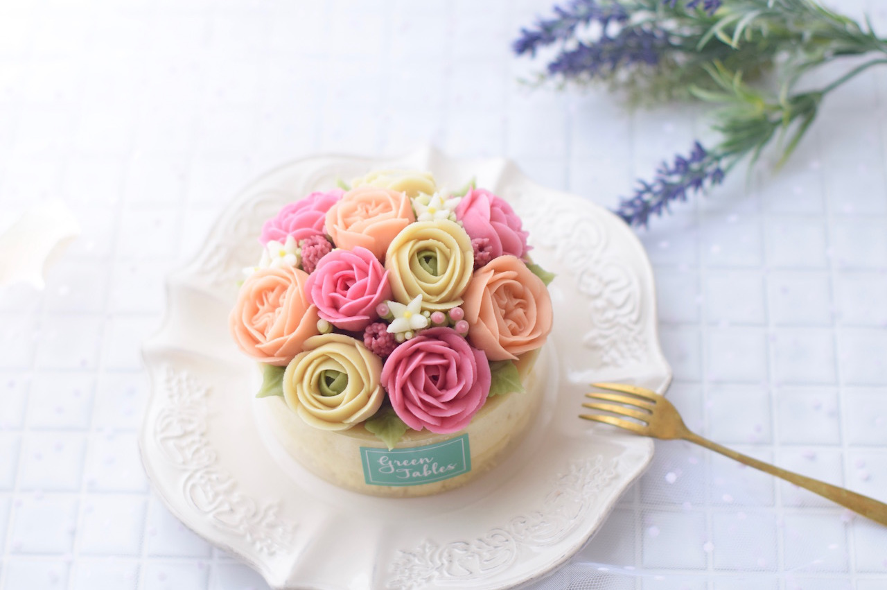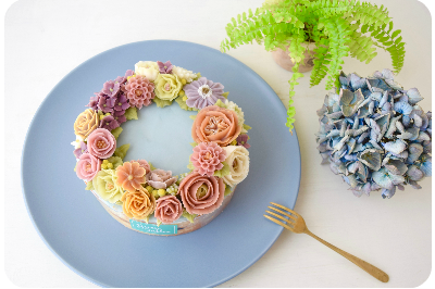 様々なお花を絞り、15cmのホールケーキ1点を作ります。