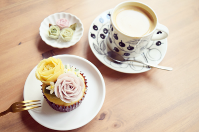 ケーキ本体生地の作り方、使用する器具について、あんの調整の仕方、色素と着色についてなど基本的な説明を行います。その後ご自身の好きな色に着色して頂き、カップケーキ4つ(お持ち帰り用)を作ります。お花はアップルブロッサム、ガーベラ、バラとバラの蕾です。