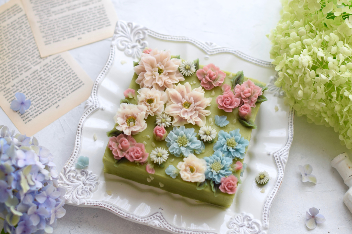 スクエアの形のケーキに自然に咲き誇るガーデンのようなケーキを作りましょう!