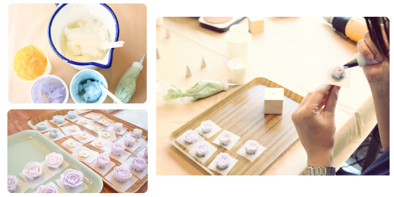 パイピングとはクリーム状のものを薄く、もしくは細く絞り出し、ケーキやクッキーなどをデコレーションする技術の事です。アイシングクッキーなどでよく使われる技術ですが、同じ技術でお花が沢山乗ったケーキや、キャンドルを作る事ができます。お花の形にパイピングする事をお花絞りとも呼びます。