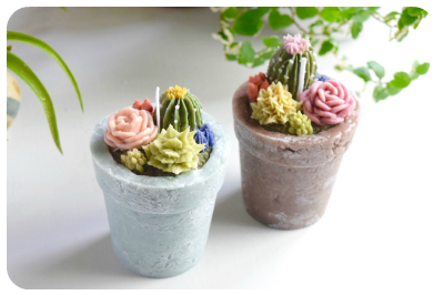 パイピングキャンドルコース経験者でない方でも受講頂ける3時間のレッスンでした。土台の植木鉢ももちろんキャンドルで出来ており、好きな色で作って頂きました。お花とはまた印象の違うサボテンや多肉植物をパイピングで形作り、最後に組み立てます。