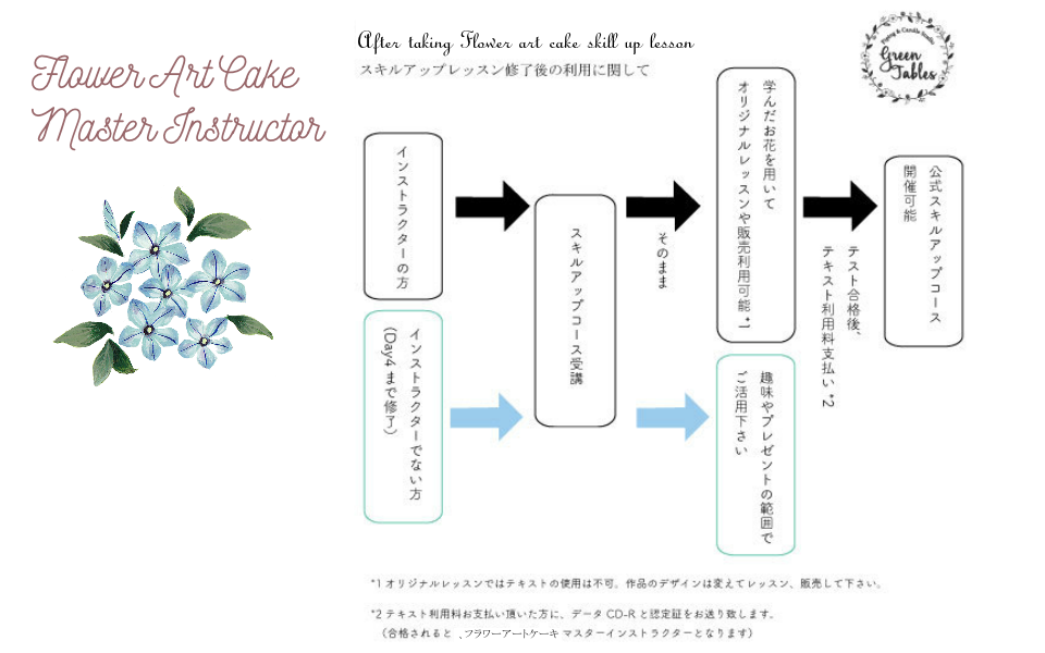 ②インストラクターの方で、テストを受講される場合 - テストを受けて頂き、合格された方は上の①に加え、同公式スキルアップコースの開講も可能です。 - テストは初回のみ無料(2回目より都度¥1000)、合格後は別途認定料8000円が必要となります。 - テストはメールにて画像送信を行うことで簡単に受けられます。合格された方は「Green Tables認定 フラワーアートケーキマスターインストラクター」として認定され、ご活動頂けます。